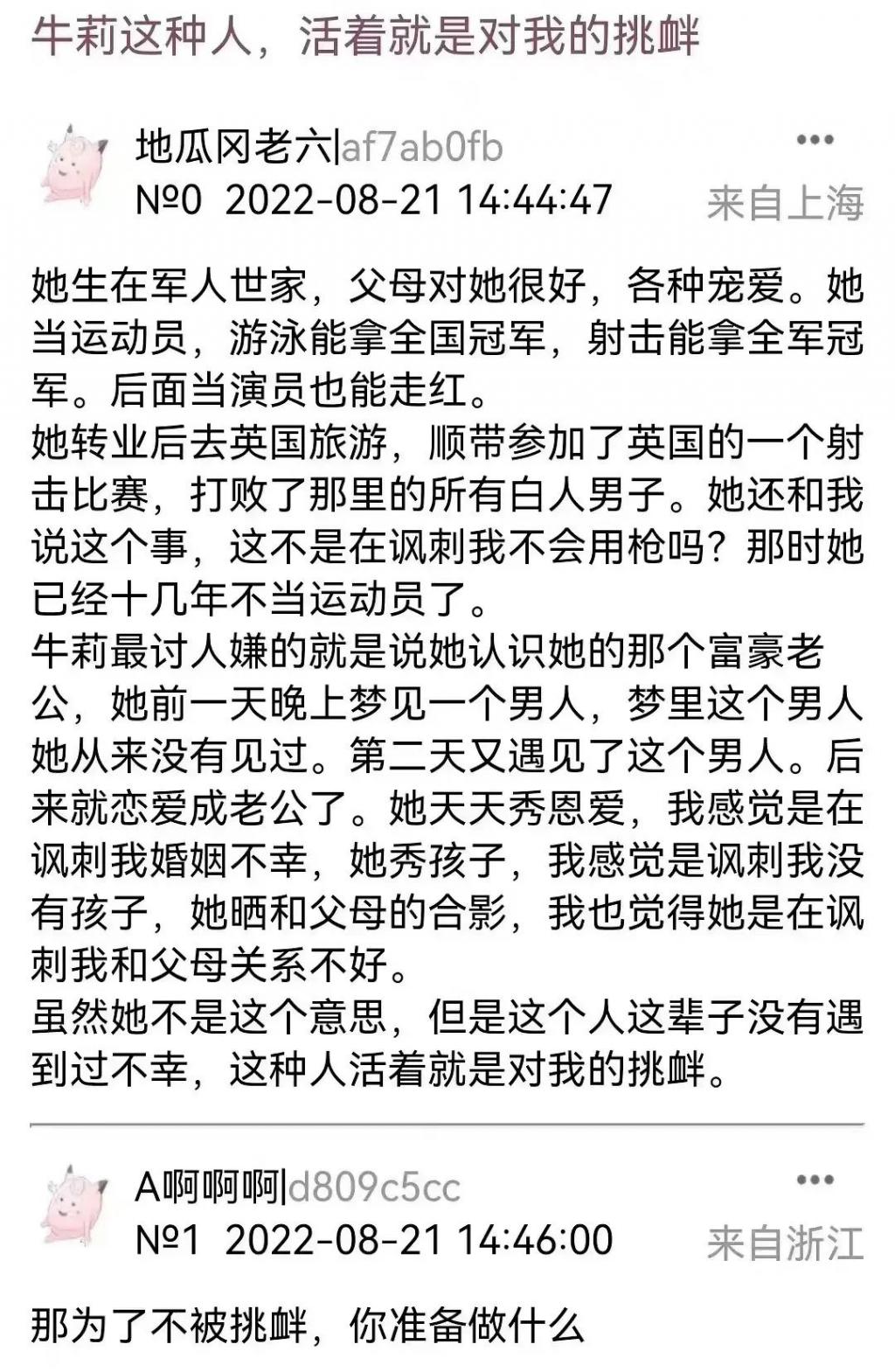袁立就看不惯牛莉人生如此完美,牛莉干什么她都觉得是在炫耀自己,嘲讽她人生失败," 牛莉这种人,活着就是对我的挑衅。"
