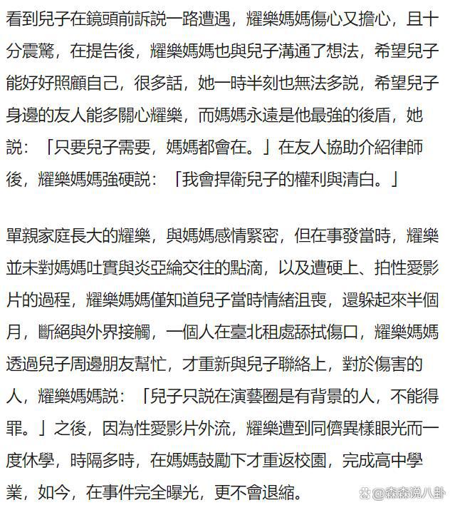 据台媒报道,耀乐从小在单亲家庭长大,与母亲关系紧密,事发前未曾对母亲吐露与炎亚纶的交往点滴,包括被侵犯的过程。当时耀乐情绪沮丧,自我封闭半个月,一个人在台北租房舔拭伤口,母亲对此无能为力,求助儿子的朋友才重新和耀乐联络上。