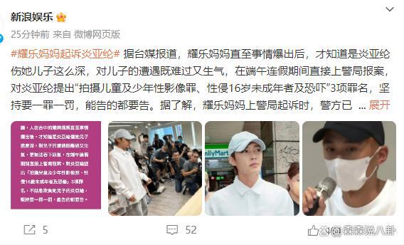 据台媒 6 月 25 日报道,网红耀乐的妈妈受访表示起诉炎亚纶,态度坚决,不会收钱了事。