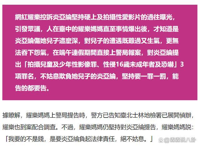 台媒此前曾采访律师,对方表示仅偷拍未成年不雅视频一项就要判 7 年以上,现在耀乐妈妈告炎亚纶犯下三宗罪,若属实不会低于 7 年。