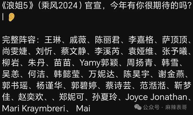 《浪姐》今年已经是第五季,前四季差不多快把人选光了,因此第五季知名度、国民度上就有点勉强。