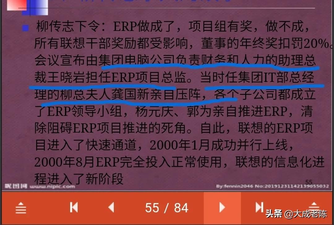 在联想1999年推行部署ERP项目实施过程中,高级副总裁朱立南任ERP项目总指挥,由于引进ERP是龚国兴率先提出的,所以由时任IT部总经理的龚国兴亲自压阵,集团电脑公司负责财务和人力资源的助理总裁王晓岩担任ERP项目总监,在这里确定了柳传志夫人当时在联想的确切职务,IT部总经理,就是负责联想内部信息化、办公自动化工作的,即使柳传志在联想再怎么一言堂,可能让自己的老婆去管财务吗?况且当时作为国企的联想来说,人员的认命也不是柳传志一个人说了算,还有董事会、总裁办呢?