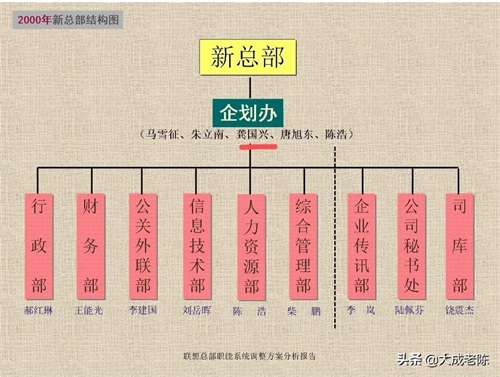 那OA部是一个什么样的部门,和财务部有关联吗?OA是负责企业办公自动化系统部署的一个部门,也可以理解成信息中心,(OfficeAutomation,简称OA)是将计算机、通信等现代化技术运用到传统办公方式中,进而形成的一种新型办公方式,简单一点来说就是负责联想公司办公自动化、信息化的,这个部门与财务部门是并列的一个机构,并没有相关资料表明龚国兴任联想OA部总经理兼财务部总经理,那她怎么能掌握联想的财务大权呢?你当联想是两个人的夫妻店啊,联想财务部门,是北京联想财务部门还是香港联想财务部门,是向北京这边董事会还是香港那边董事会报送财务报表呢?北京联想作为香港联想的股东,它也没义务向香港联想报送报表啊,这里张捷老师可不能这样说的模棱两可,你最起码还是一位律师呢?你说是不是?而根据联想的相关资料来看,龚国兴任联想企划部副主任,这个是有确切依据的,在联想总部职能系统调整方案分析报告中,从2000年新总部结构图中我们可以看出,联想新总部下边是企划办,人员有马雪征、朱立南、龚国兴、唐旭东、陈浩五人,企划办的职责是在联想公司宗旨和长远发展战略目标的指导下,牵头推进公司重大战略项目的落实工作,确保联想公司各项战略及重要工作落实到位,提升公司管理水平,提高各项业务竞争力,可以说是把握联想发展大方向的一个部门,作为企划办副主任的龚国兴,怎么可能像张捷老师随随便便说的是掌握联想财务的老板娘呢?