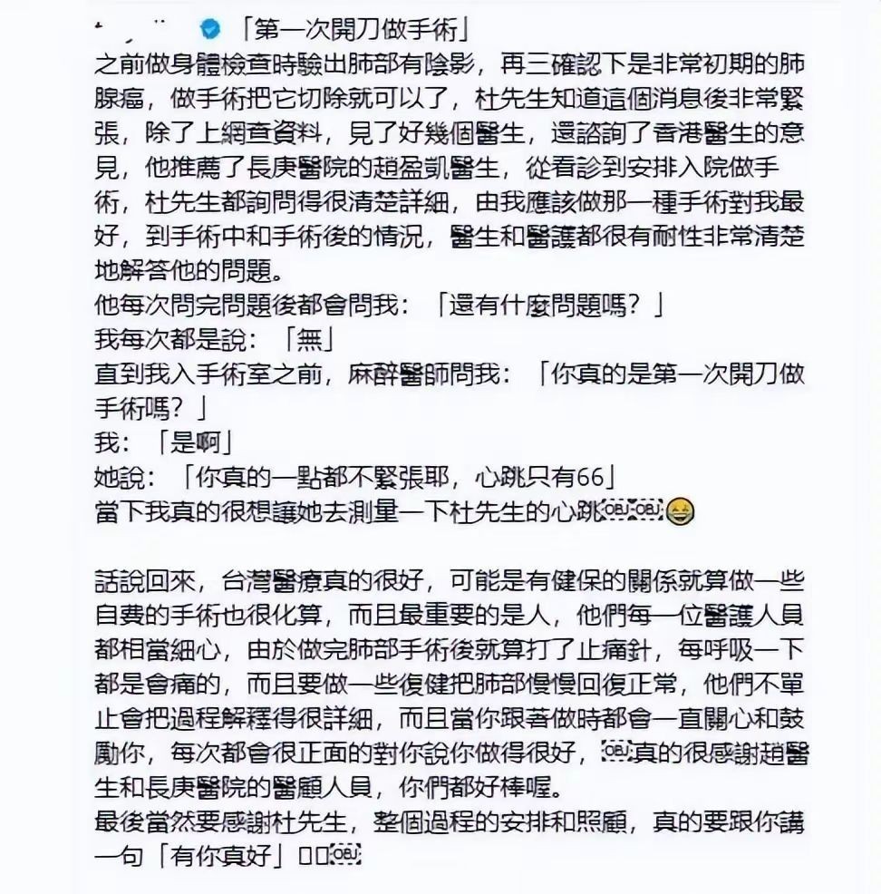 听说田蕊妮的肺癌是早期,医生说她的癌症只有0期,只需要切除5%的肺部,前景还是比较乐观的。手术之后,杜汶泽在社交媒体上喜滋滋地分享了这个好消息,感谢了医护人员,也算是给人们带来了一点希望。