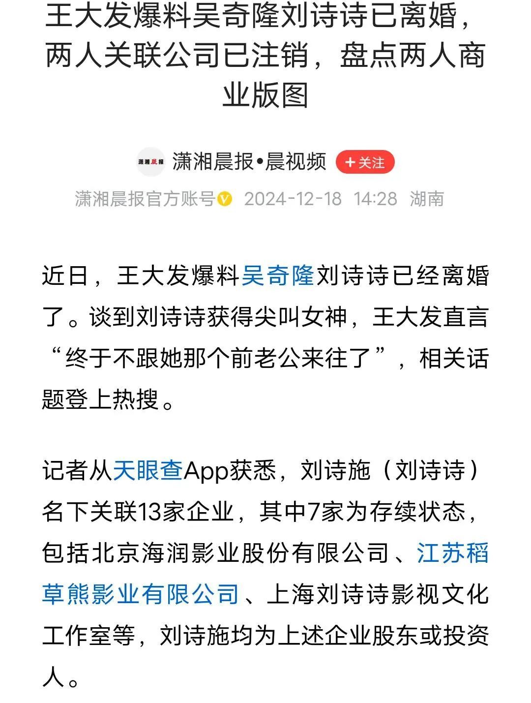 官媒报道刘诗诗吴奇隆离婚,两人合开的公司黄了,孩子传的更炸裂