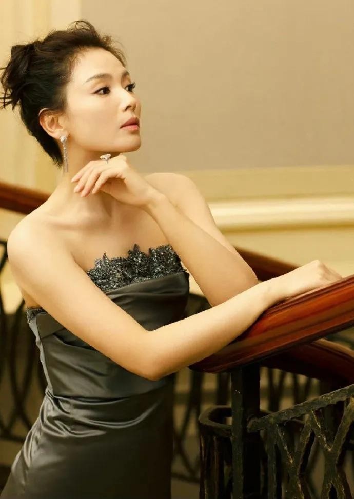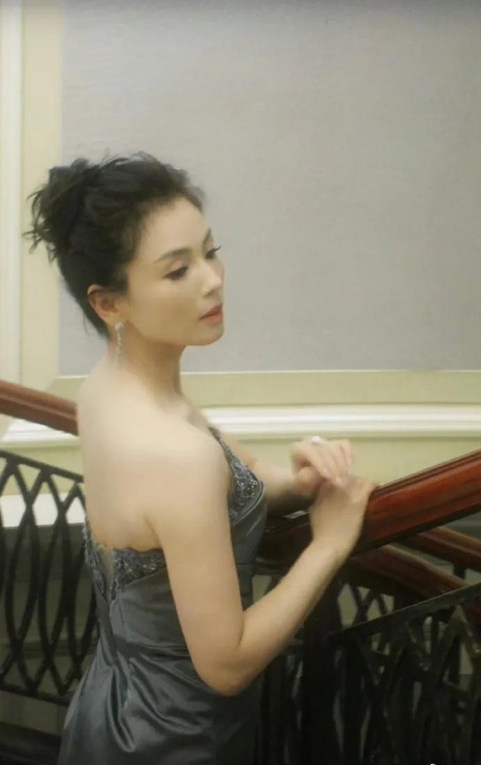 刘涛身穿一袭灰黑色抹胸衣裙,她侧身扶住楼梯,俏脸斜视若有所思,这位美女五官精致,秀发梳起来很端庄,肌肤白皙如雪,曼妙的身材曲线,绝对性感撩人!