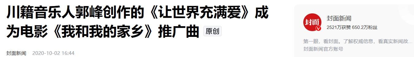 信源2:封面新闻2020-10-02 16:44 川籍音乐人郭峰创作的《让世界充满爱》成为电影《我和我的家乡》推广曲