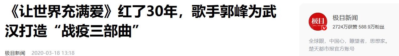 信源3:极目新闻2020-03-18 13:18 《让世界充满爱》红了30年,歌手郭峰为武汉打造“战疫三部曲”
