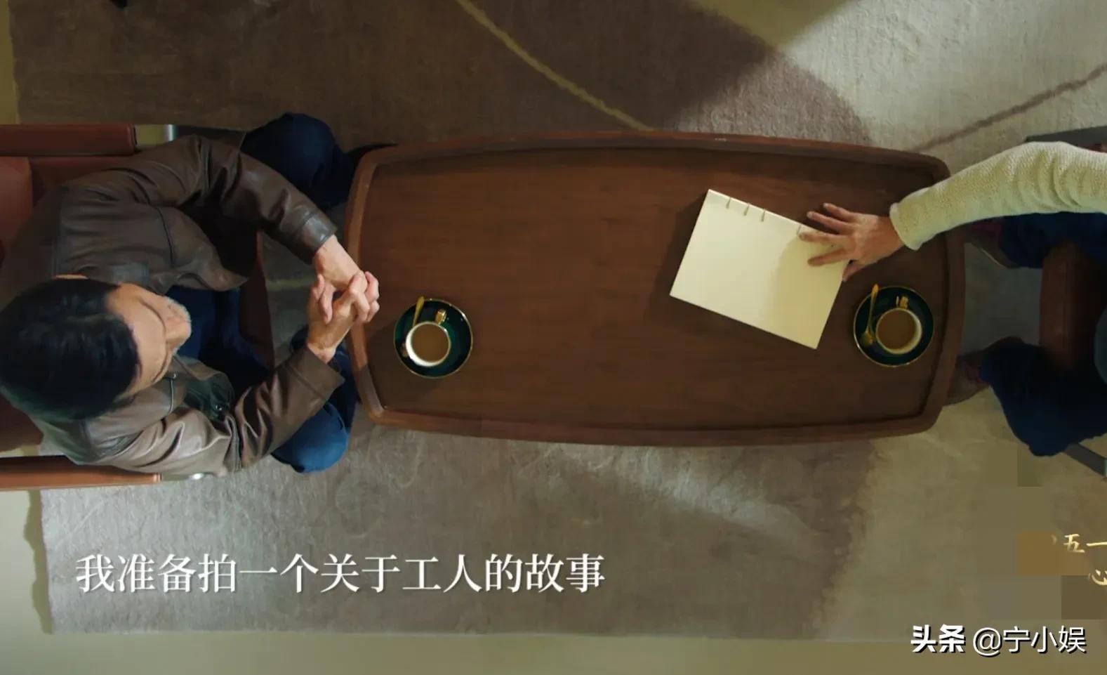 镜头从舞台一转,他和导演正在谈合作,对方给他了一个剧本,想要邀他拍摄一个关于工人的片子,梁家辉便顺手拿起来认真翻看。