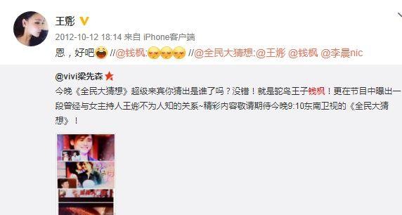 看看当时的王烿怎么回复的,嗯,好吧,并一脸开心。可想而知,那会儿钱枫和王烿的感情,到底有多好,要不然,王烿也不会在节目上大胆亲吻钱枫。直至后来《全民大猜想》再度同台,两人这才在荧幕面前说做回了朋友。