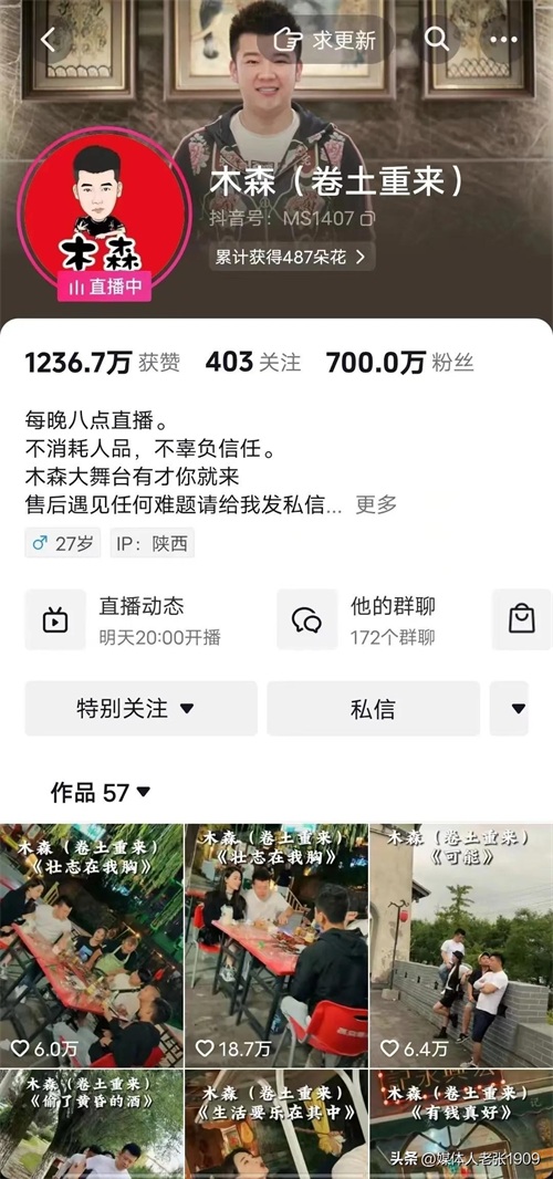最近抖音上一个叫木森的,短短一年时间从零粉丝涨到700万,木森,原名:张佳帆,网络主播,男歌手,1996年6月10日出生于陕西西安,截至2023年9月23日,他在抖音上拥有700.8万的粉丝,1239.1万点赞。木森的成功绝非偶然,而是靠自己辛苦付出和努力的回报。付出了常人没有的努力和常人没有尝过的心酸。