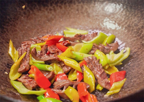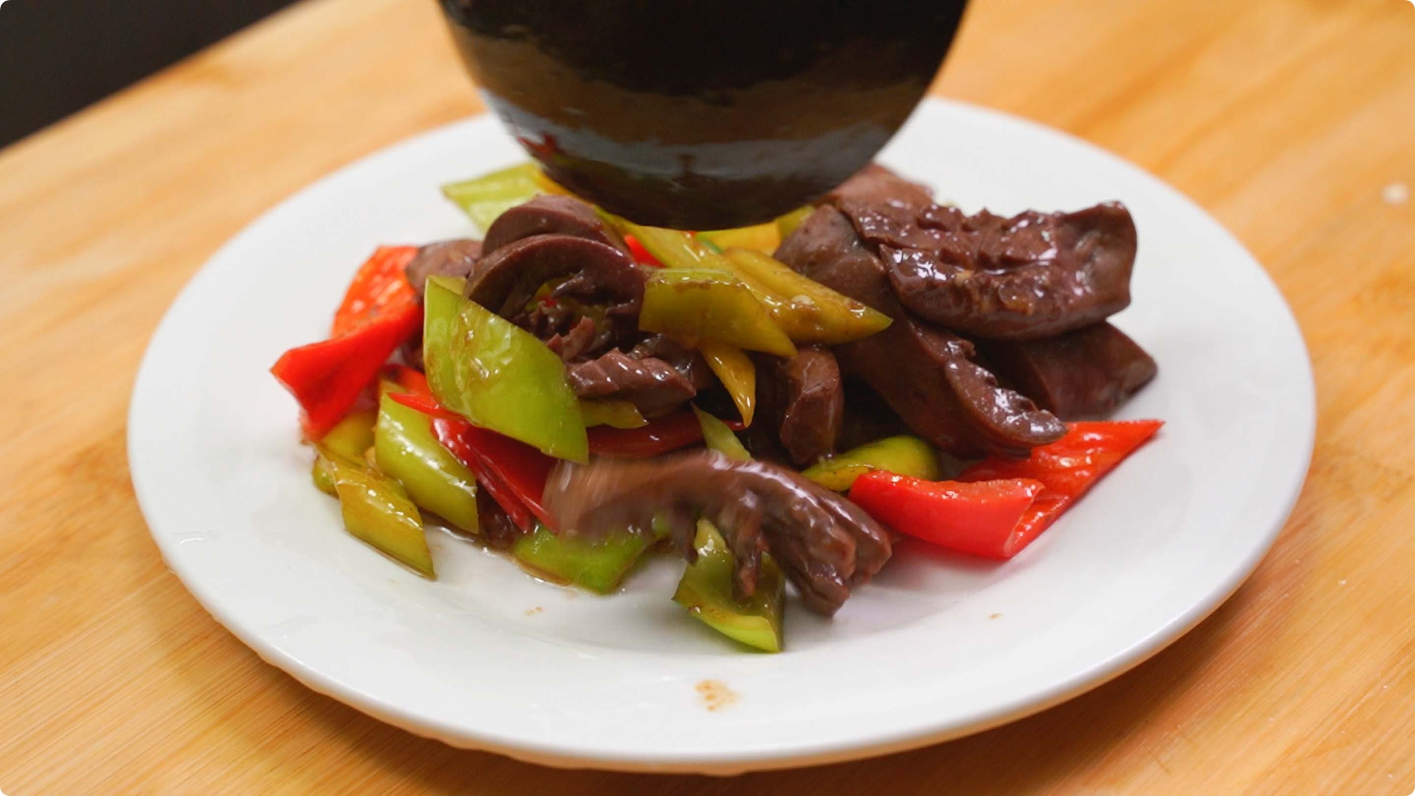 再下入刚过油好的腰花和青红椒,大火爆炒,