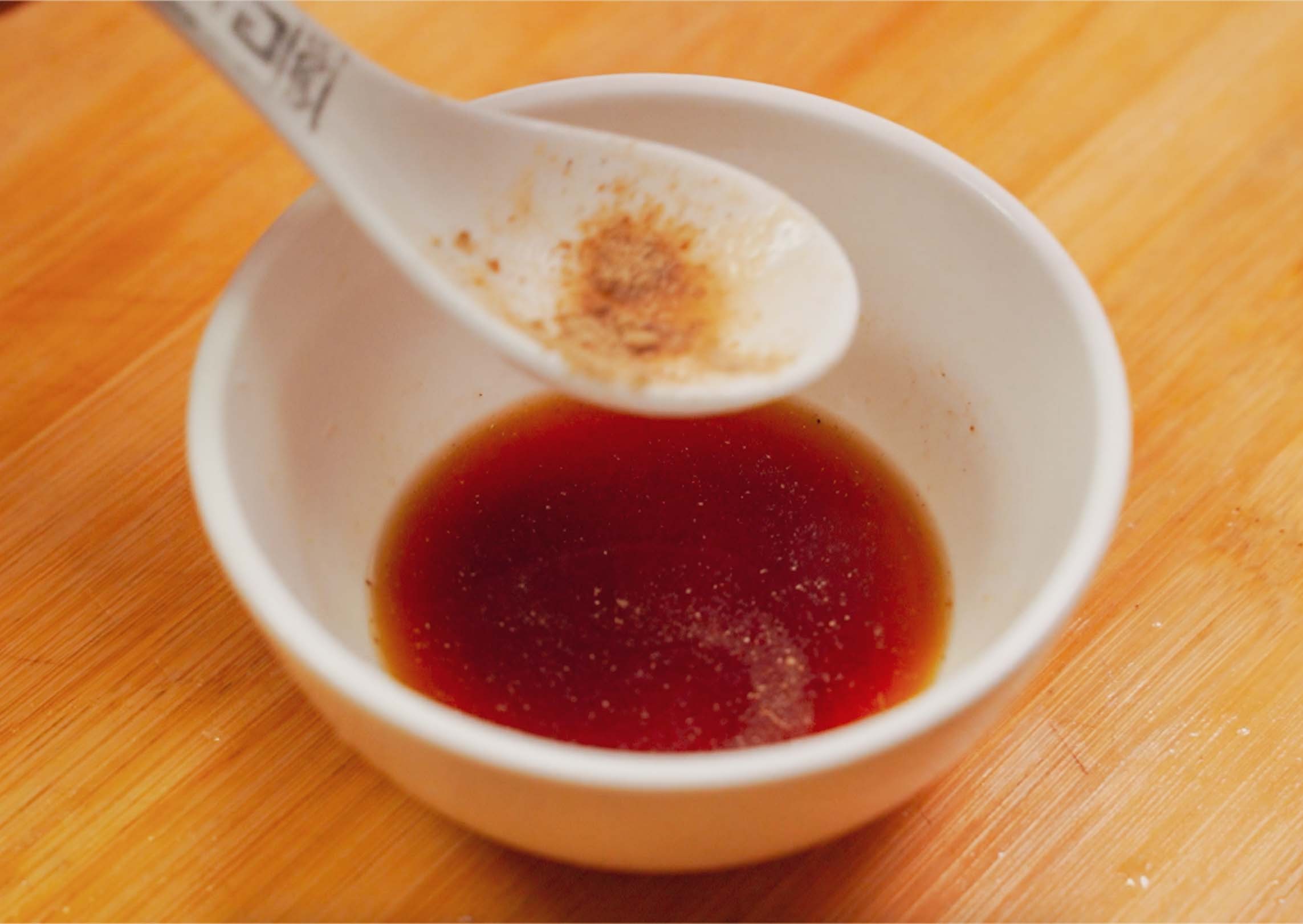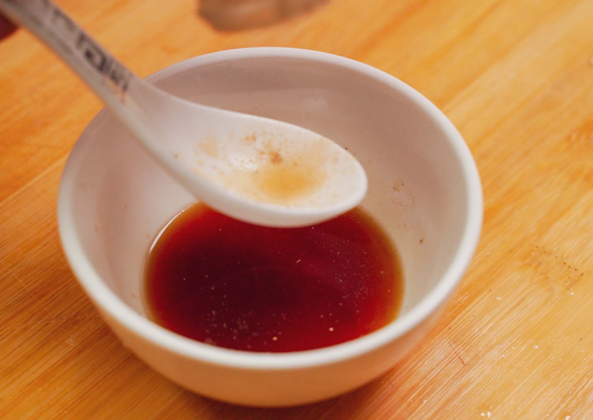 调制碗汁,加入生抽10克、味精5克、盐5克、白糖3克、胡椒粉1克,然后再搅拌均匀。