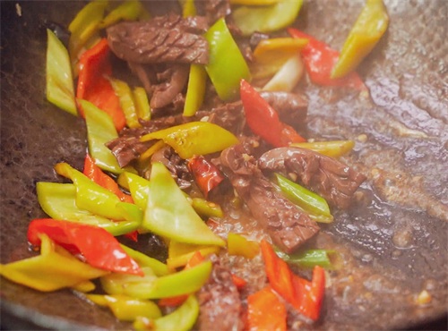 看到腰花和青椒基本成型成熟既可以捞出来,控干油份。