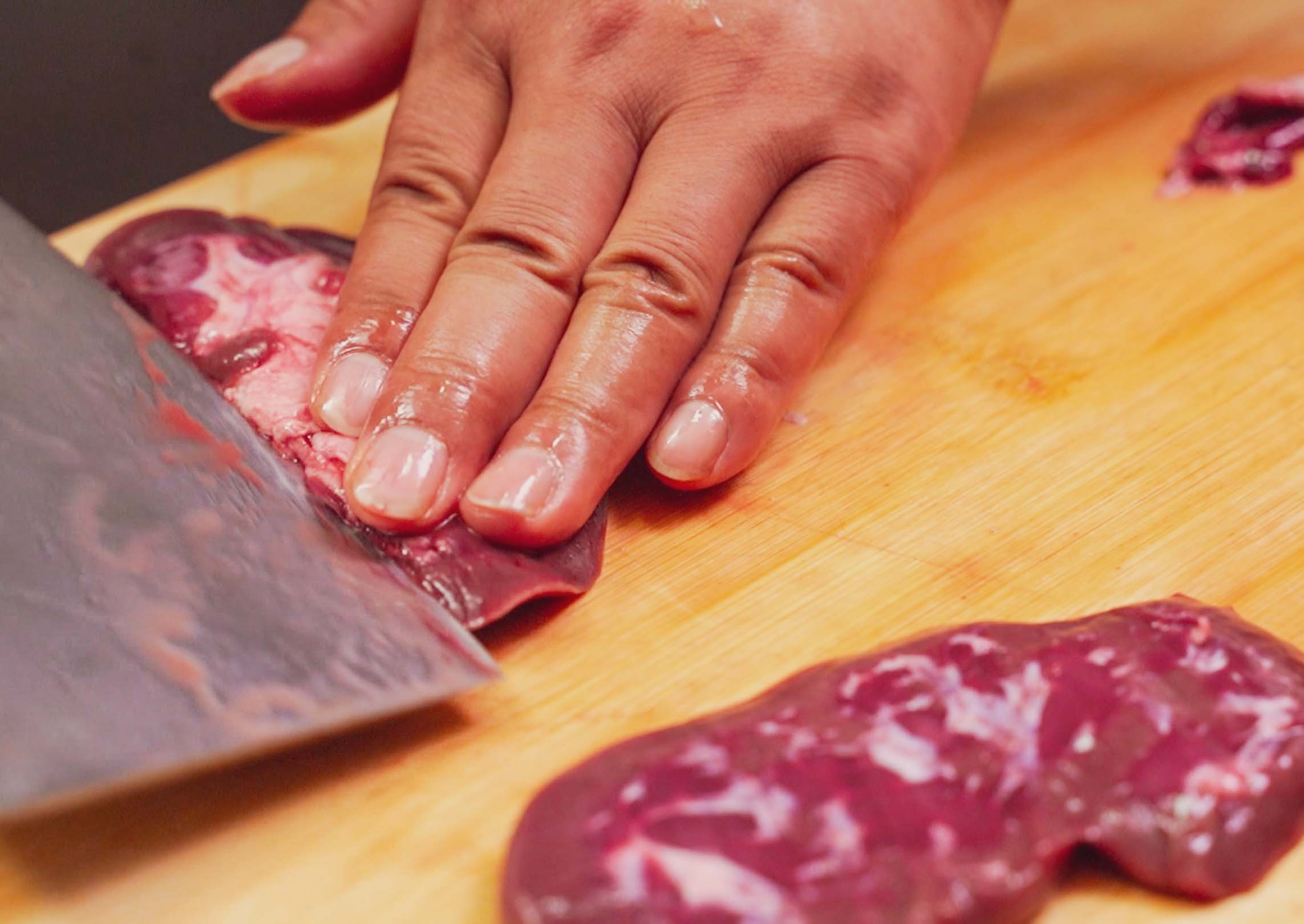 然后去除腰骚味,再将处理好的猪腰打上花刀,切成大小均匀的条。
