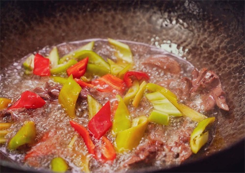 将准备好的青红椒放入一起过油,然后捞出放置一边控油。