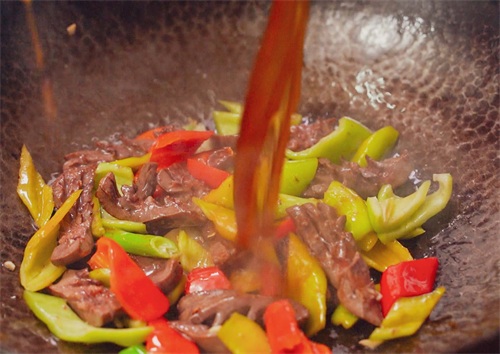 烹入调好的料汁,快速翻炒均匀,即可出锅装盘。