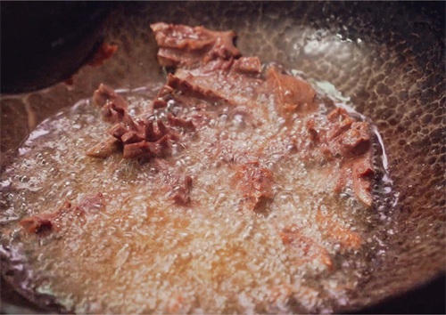 2 在这道菜的烧制过程中,容易忽略的一个步骤是,在爆炒前必须将食材过油定型一下,在较大程度上促使食材中的水气被蒸发掉,这样做出来口感更好。