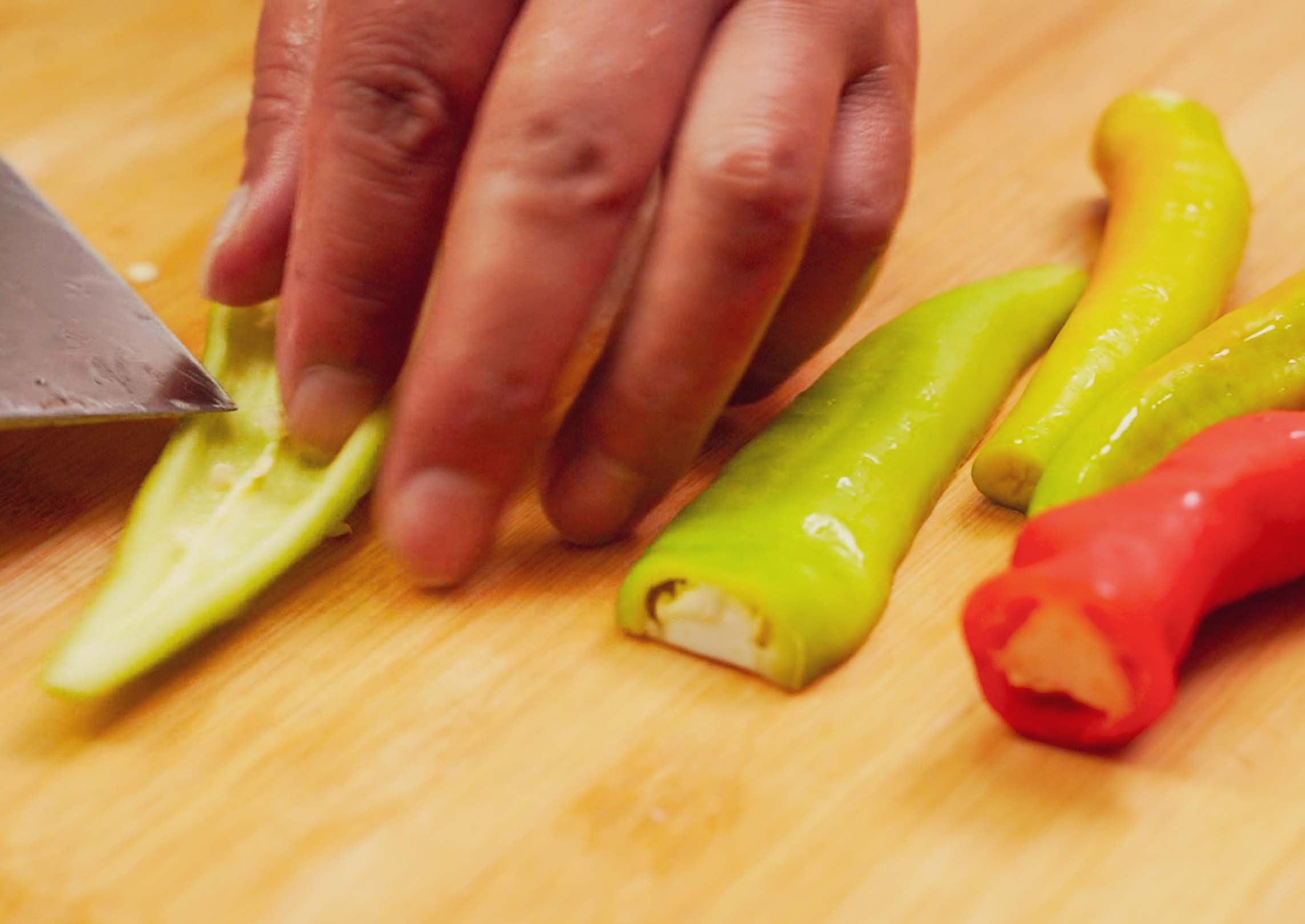 将买来的青红椒去籽儿,洗干净,用刀切成小块儿,