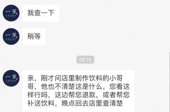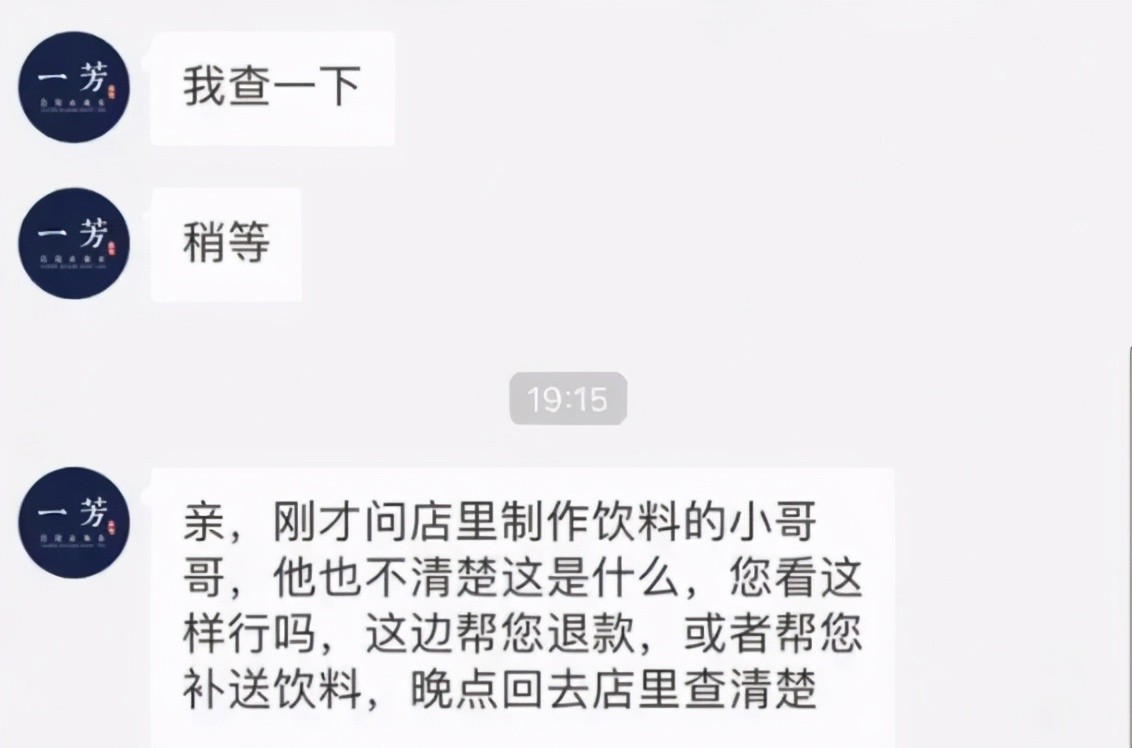 30日凌晨2时34分,该网友第三次发布图片,是其与头像显示为“一芳台湾水果茶”店方的对话截图,截图显示8月29日下午7时许,该网友将图片发给店方问询从黑糖鲜奶中喝出的黑色异物是什么东西,店方回复称问过店里制作饮料的工作人员,工作人员也不清楚这是什么,并称为该网友退款,或者补送饮料,晚点回店查清楚。