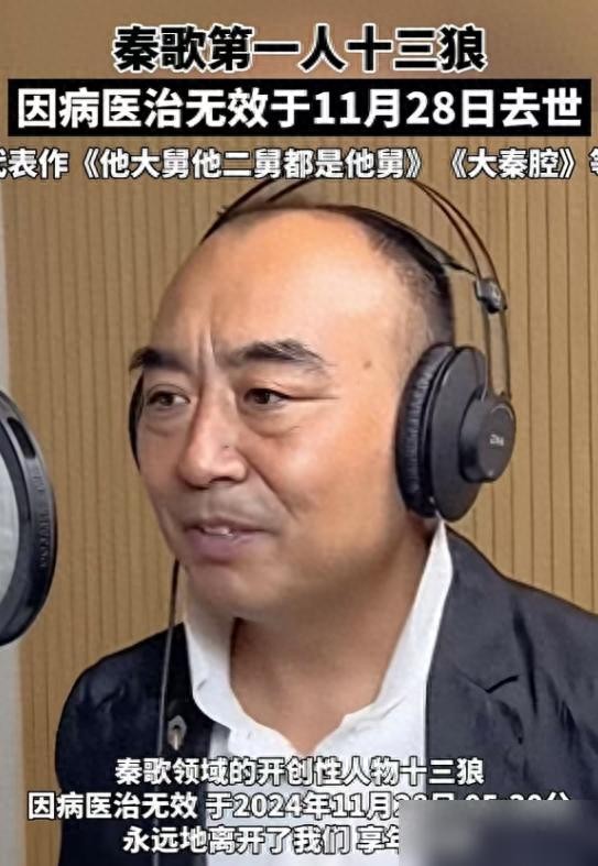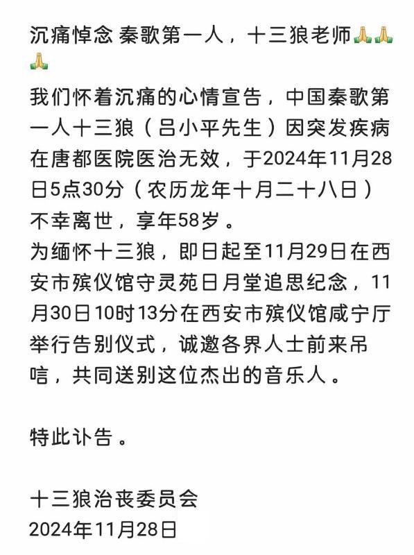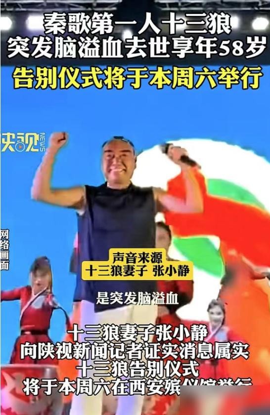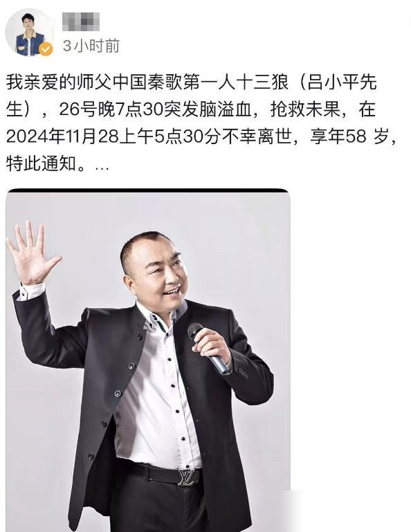 2023年11月28日,秦歌界第一人“十三狼”因突发脑溢血去世享年58岁,前妻发布消息感慨万分,许多粉丝看到这一消息后纷纷表达哀悼之情。