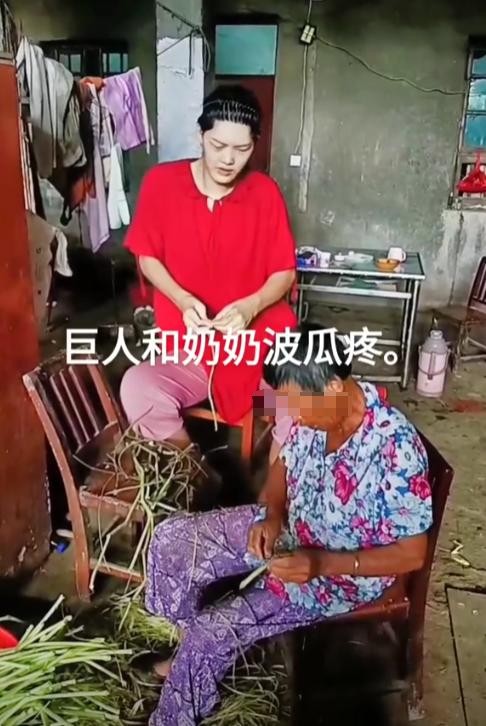 爷爷身材也比较娇小,被2.3米的小莫扶着有点吃力,
