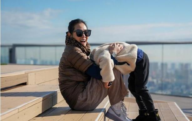 在这张照片中,刘若英穿着一件棕色的羽绒服和一条宽松的休闲裤,还围着一条比较成熟的豹纹围巾,坐在台阶上。她的儿子特别顽皮的弯腰站在她的面前,一头埋在妈妈的怀里撒娇嬉戏玩耍。
