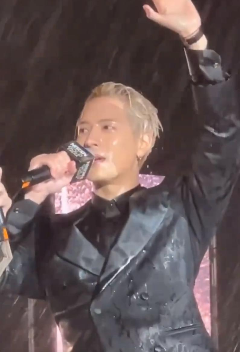 一开始,活动现场下着小雨,到最后居然下起了大雨,王嘉尔和主持人干脆连伞都不打,直接在暴雨中跟粉丝互动。好在这场大雨并没有毁掉王嘉尔的造型,反而在他把刘海都撩起来之后,显得更野性。