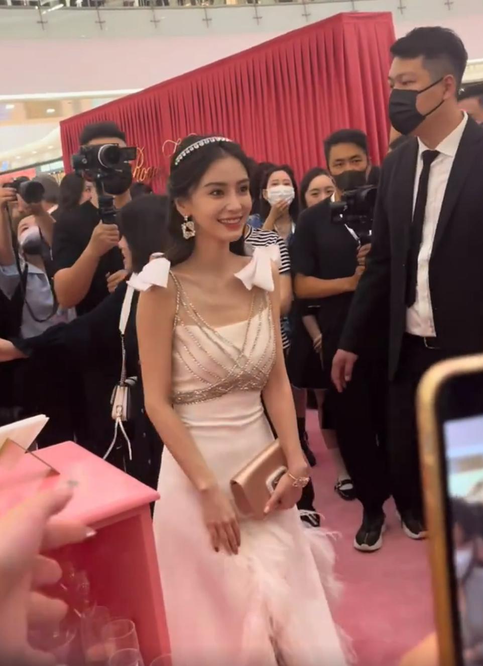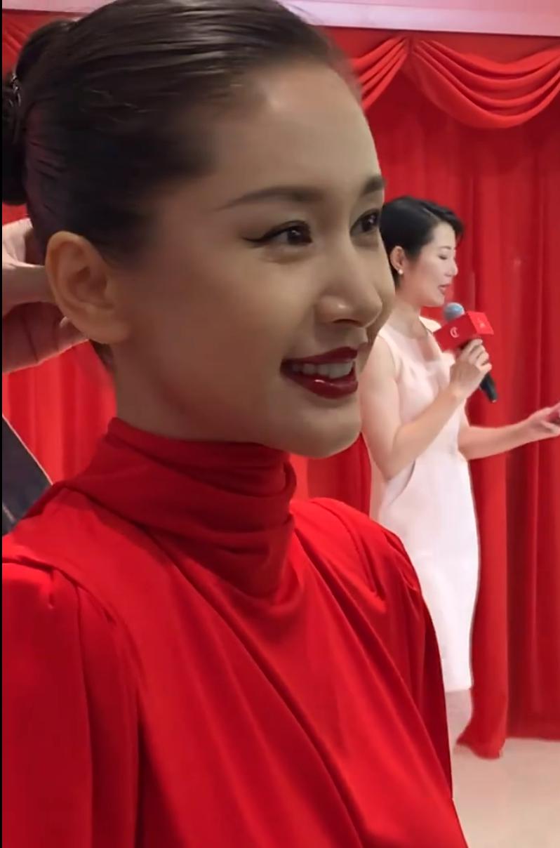 在活动现场,Angelababy 一直跟现场的粉丝和路人互动,所以出现在路人镜头中一直都是笑着的,比较有亲和力。