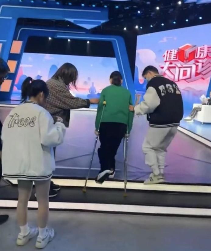这位女主持人是马滢,到舞台前,为了方便录制,她从轮椅上下来换了拐杖。