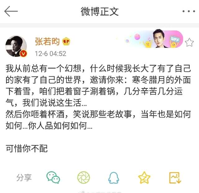 12月6日凌晨4点左右,张若昀在微博发文:“我以前总有一个幻想,什么时候我长大了,有了自己的家,有了自己的世界,邀请你来”,“我们说说这生活,然后你咂着杯酒,笑说那些老故事,到底是如何如何,你人品如何如何”。在最后张若昀说了一句“可惜你不配”,本来张若昀的描述十分的温馨,没想到最后一句话竟然是如此毒辣,看着有种十分黑暗的感觉。也许在凌晨时候,人的心里总是这么脆弱,不过在发完之后,张若昀就秒删了微博,也许不想自己一时的心情引起网友猜测。