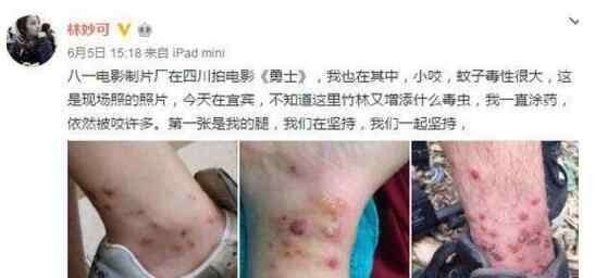 林妙可被毒虫咬伤发微博称:“八一电影制片厂在四川拍电影《勇士》,我也在其中,小咬、蚊子毒性很大,这是现场照的照片,今天在宜宾,不知道这里竹林又增添什么毒虫,我一直涂药,依然被咬许多。第一张是我的腿,我们在坚持,我们一起坚持。”