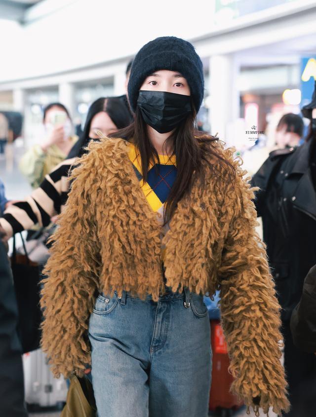 这次她穿了一件金色的毛绒夹克,搭配浅蓝色的牛仔裤,秀出修长的美腿和完美的身材,搭配灰色的鞋子,气场十足。