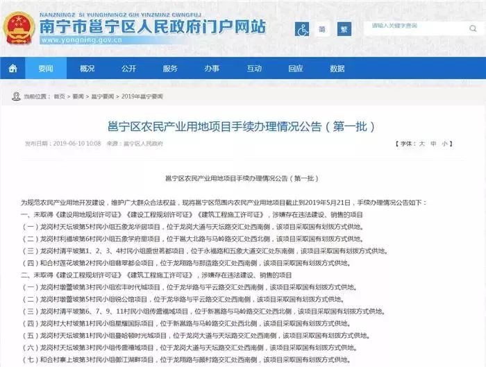 6月10日,邕宁区政府官网上发布一则《邕宁区农民产业用地项目手续办理情况公告(第一批)》的公告,明确指出:公告所述15个产业用地项目不能用于商品住宅开发,所建设的房产不能出售,不能办理预售证和个人不动产权证,敬请广大市民慎重购买、投资上述房产。