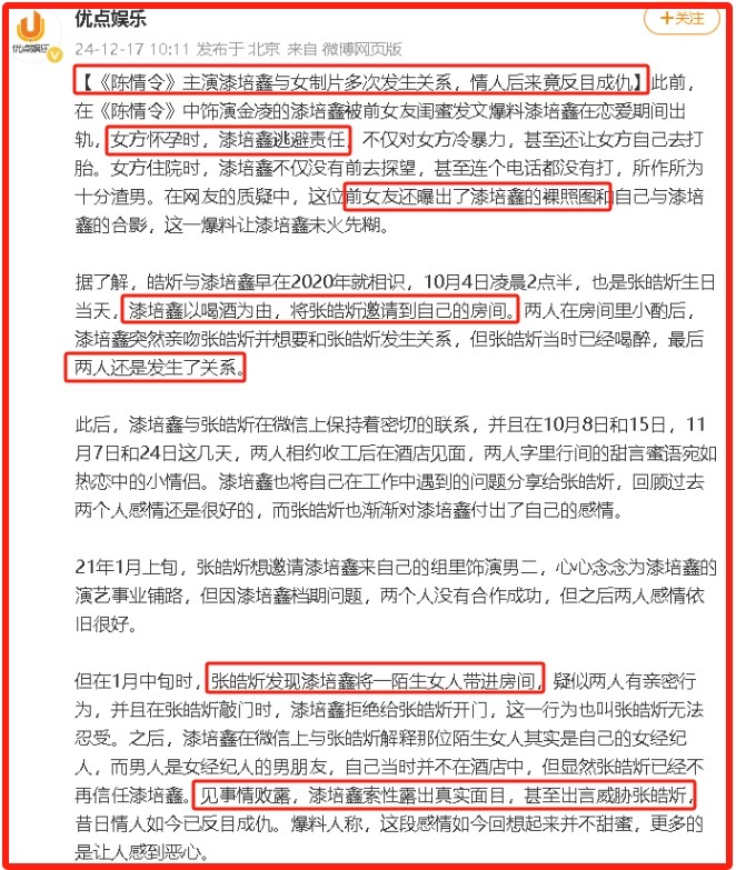 最近又发生了一件震动娱乐圈的劲爆新闻——《陈情令》中的男演员漆培鑫与女制片人张皓炘之间的爱恨纠葛。