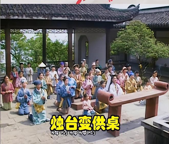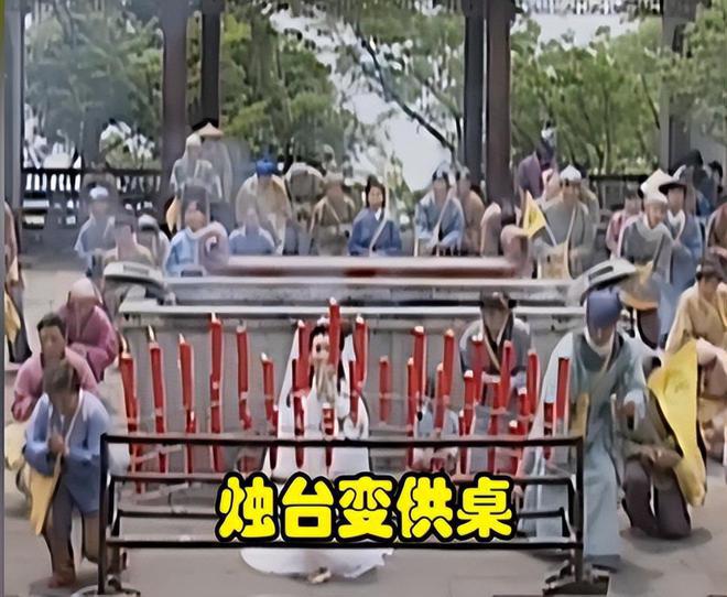 但是镜头一转,前边的烛台全部变成了供桌,身后跪着的群演也全部都变了。