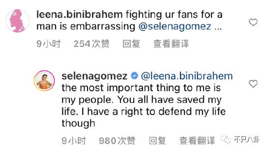 赛琳娜则回复表示:对我来说最重要的事情就是我的家人亲朋,我有权利捍卫我的生活。