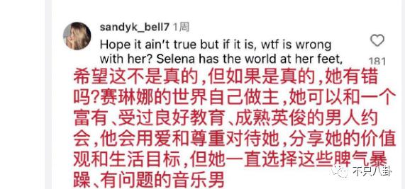 还有粉丝吐槽明明有那么多帅气聪明有天赋洁身自爱的男人可选,但赛琳娜偏偏爱选问题男孩当男友。
