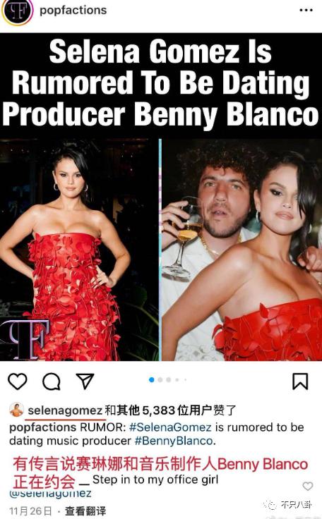她先是给爆料自己与 Benny Blanco 谈恋爱的发文点赞,承认恋爱,给足 Benny Blanco 面子。