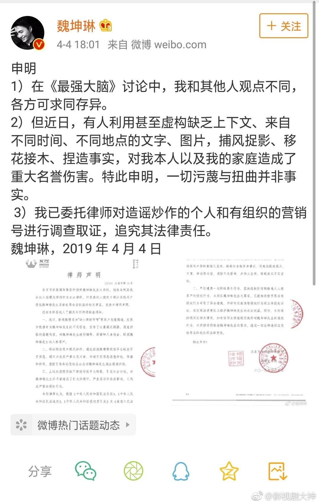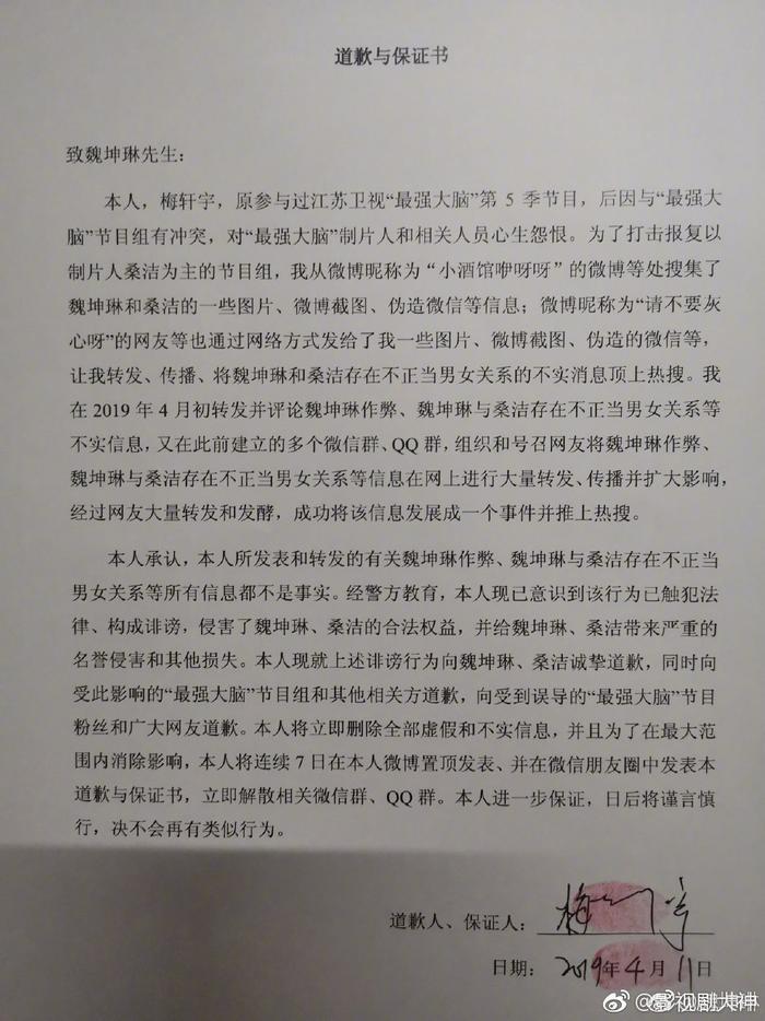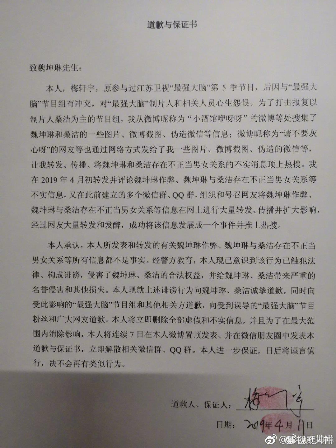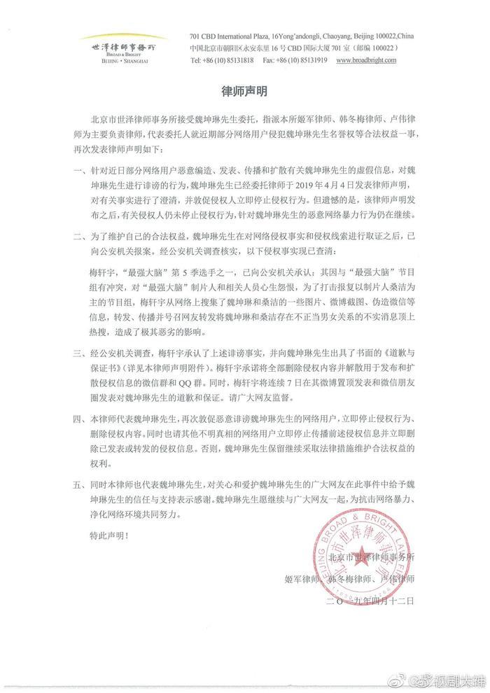 魏坤琳微博晒选手梅轩宇的道歉声明,表示后续会公布更多的法律调查结果,相信真相终会大白,相信法律必有公正。你们以后还会看《最强大脑》吗