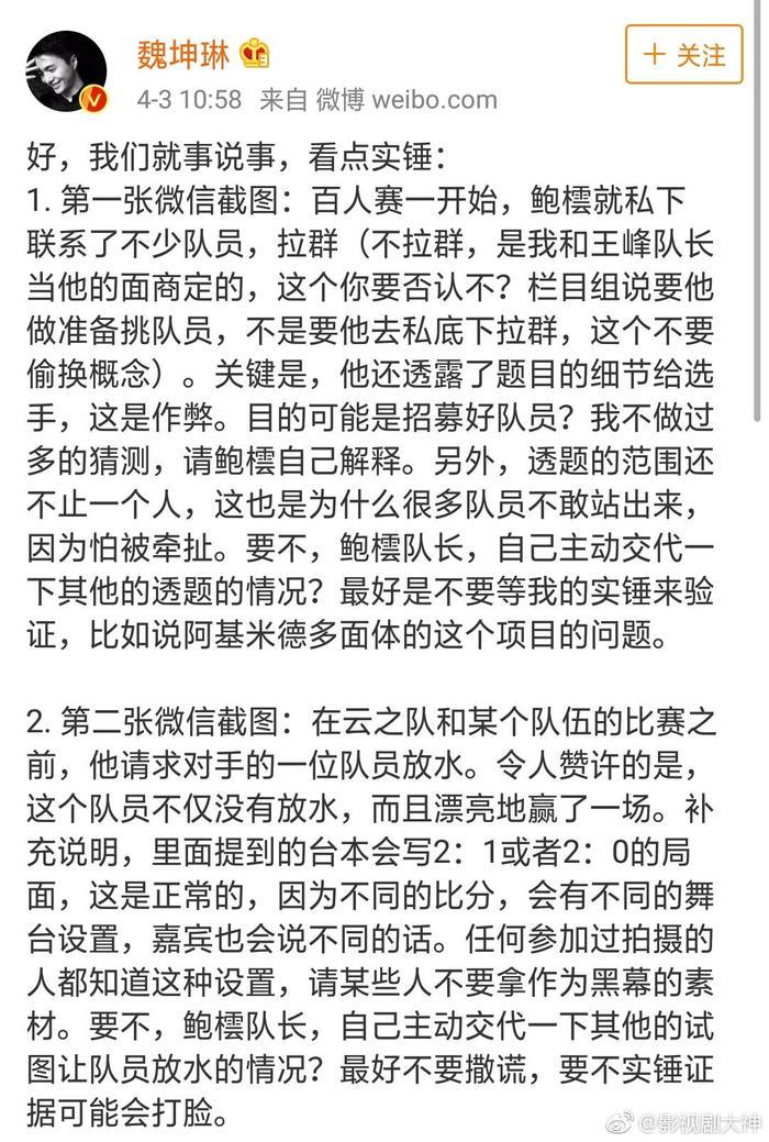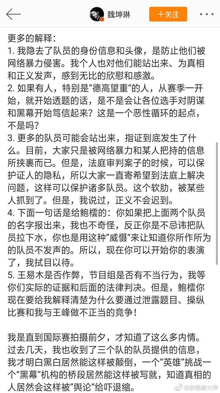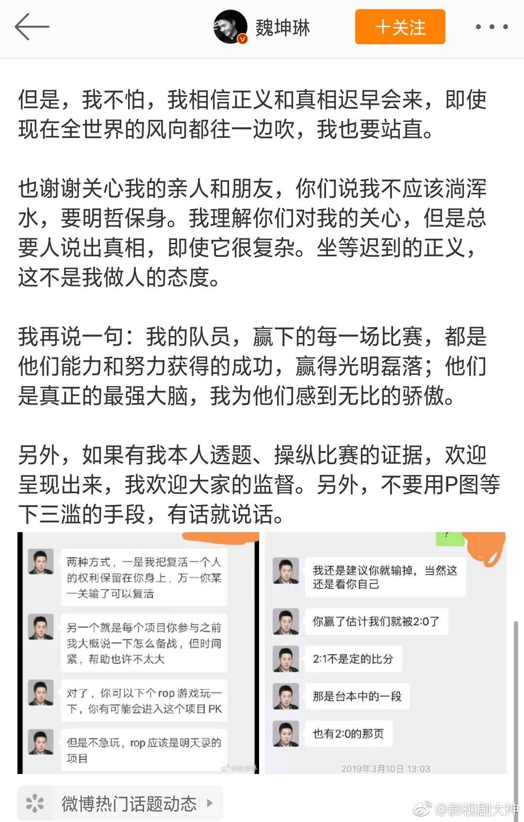 魏坤琳微博晒选手梅轩宇的道歉声明,表示后续会公布更多的法律调查结果,相信真相终会大白,相信法律必有公正。你们以后还会看《最强大脑》吗