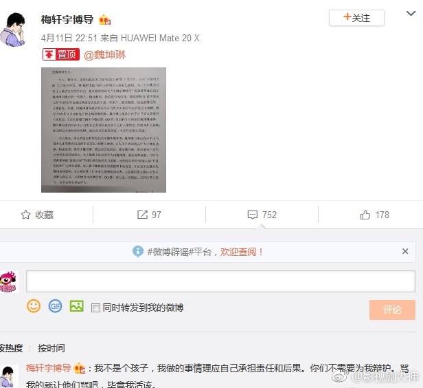 魏坤琳微博晒选手梅轩宇的道歉声明