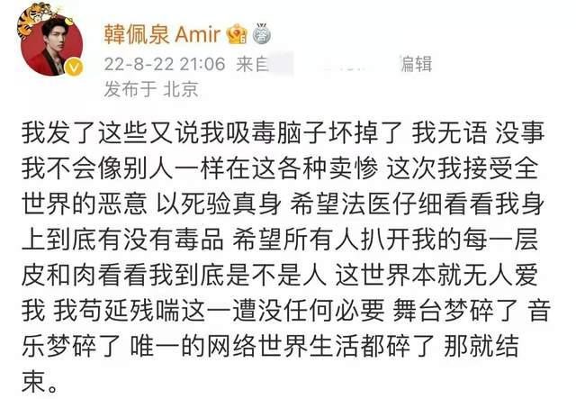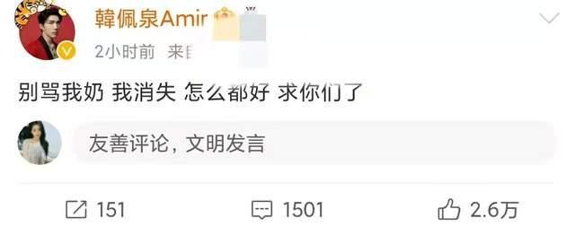 随后许多粉丝表示担忧,纷纷跑到韩佩泉的社交平台下留言,请求他不要做傻事,还有人安慰他,任何挫折都会过去的。
