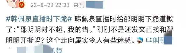 直播中,韩佩泉说出 " 邵明明对不起,我的问题,我的错 " 后,便对着镜头下跪,一边说还一边继续道歉,称自己不该在参加创造营节目时,对邵明明说的一些话,导致邵明明被网络暴力。