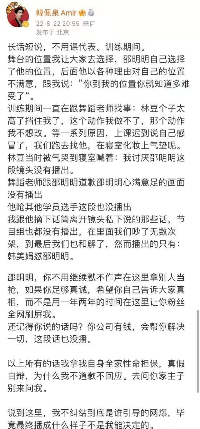 随后韩佩泉发布了长文,详述了在录制《创造营 2025》期间自己与邵明明的恩怨。