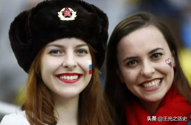 2018年俄罗斯世界杯赛场上,两名俄罗斯女球迷对着镜头微笑,左边那位戴着一个苏联时期的军帽