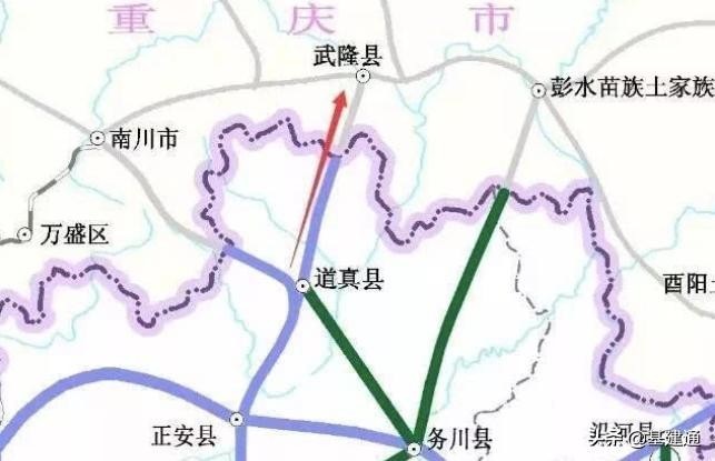 武隆(渝黔界)至道真高速公路起于渝黔界的子母岩隧道,接拟建的武隆至道真高速公路重庆段,经洛龙、河口、巴渔,止于道真县城西丘家湾,顺接已建成的道真至瓮安高速公路道真支线,路线全长37.785公里。 主线采用四车道高速公路标准建设,设计速度80公里/小时。