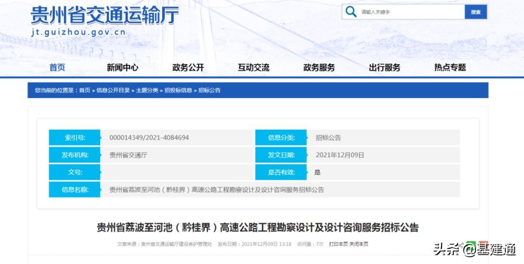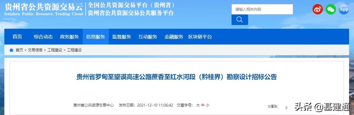 2021年12月10日,贵州省公共资源中心发布贵州省罗甸至望谟高速公路蔗香至红水河段(黔桂界)勘察设计招标公告。