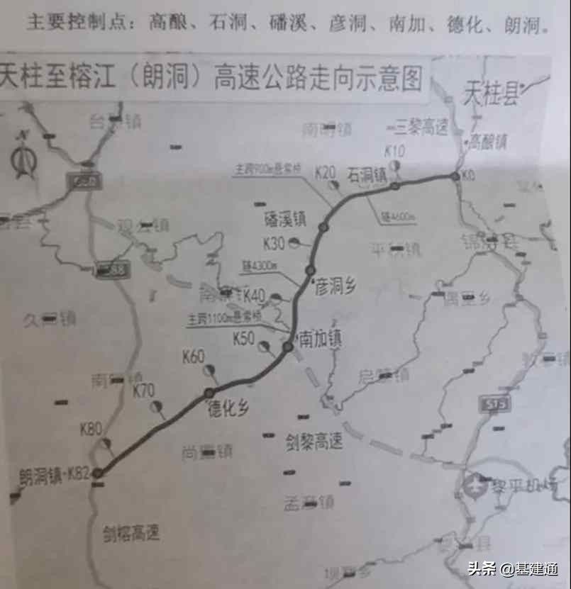 根据勘测单位出示的示意图,起点为天柱县高酿镇附近,在高酿镇设置T型互通连接松从高速,之后经天柱县石洞镇、剑河县磻溪镇、锦屏县彦洞乡、剑河县南加镇、黎平县德化乡,终点位于榕江县朗洞镇,在朗洞镇设置T型互通连接沿榕高速,在南加镇设置枢纽互通连接剑黎高速。全线设置高酿(天柱南)、石洞、磻溪、彦洞、南加、德化、朗洞等7个出入口。预计本项目将于2022年至2023年度开工建设,届时天柱将可以由此前往南部的榕江、荔波,这条高速公路将为天柱县以及沿线乡镇提供南下广西北部湾的新通道。