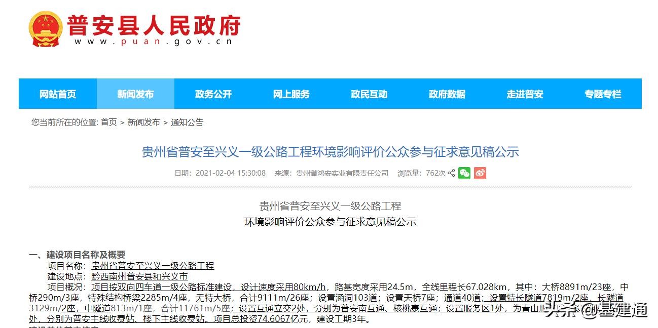 10 月27日,贵州省生态环境厅公示了六枝至安龙高速公路项目环境影响报告书。并且这个项目已经在20年4月公布社会投资人中标。根据省发展改革委作出的批复,六枝至安龙高速公路项目估算总投资243.06亿元。项目建设工期(自开工之日起)3年半。